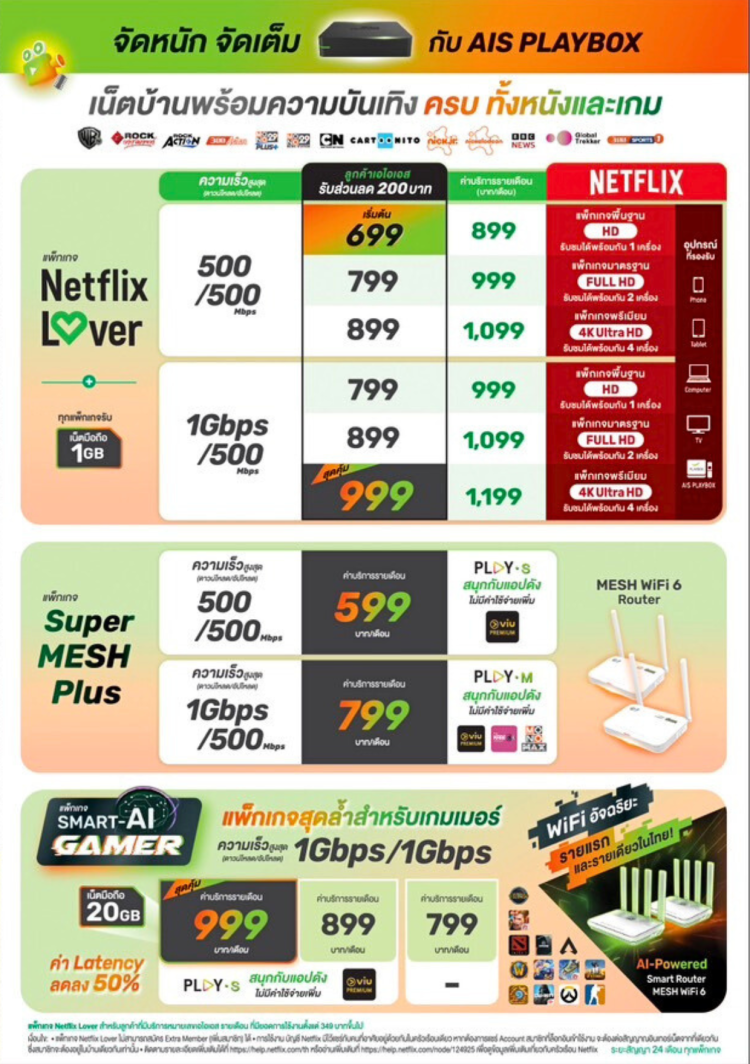 เน็ตบ้าน AIS 500/500 พร้อมกล่องดูทีวี ราคา 599 บาท / เดือน
